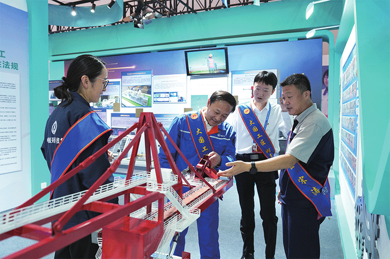 9月25日,全国五一劳动奖章获得者刘洪吉(左一)在河北展区向来访同行介绍创新成果特点。