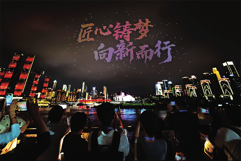 9月22日,5000架无人机点亮重庆夜空,以瑰丽灯光秀向大国工匠致敬。