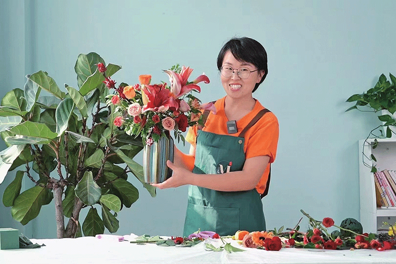 李军田展示自己的插花成果